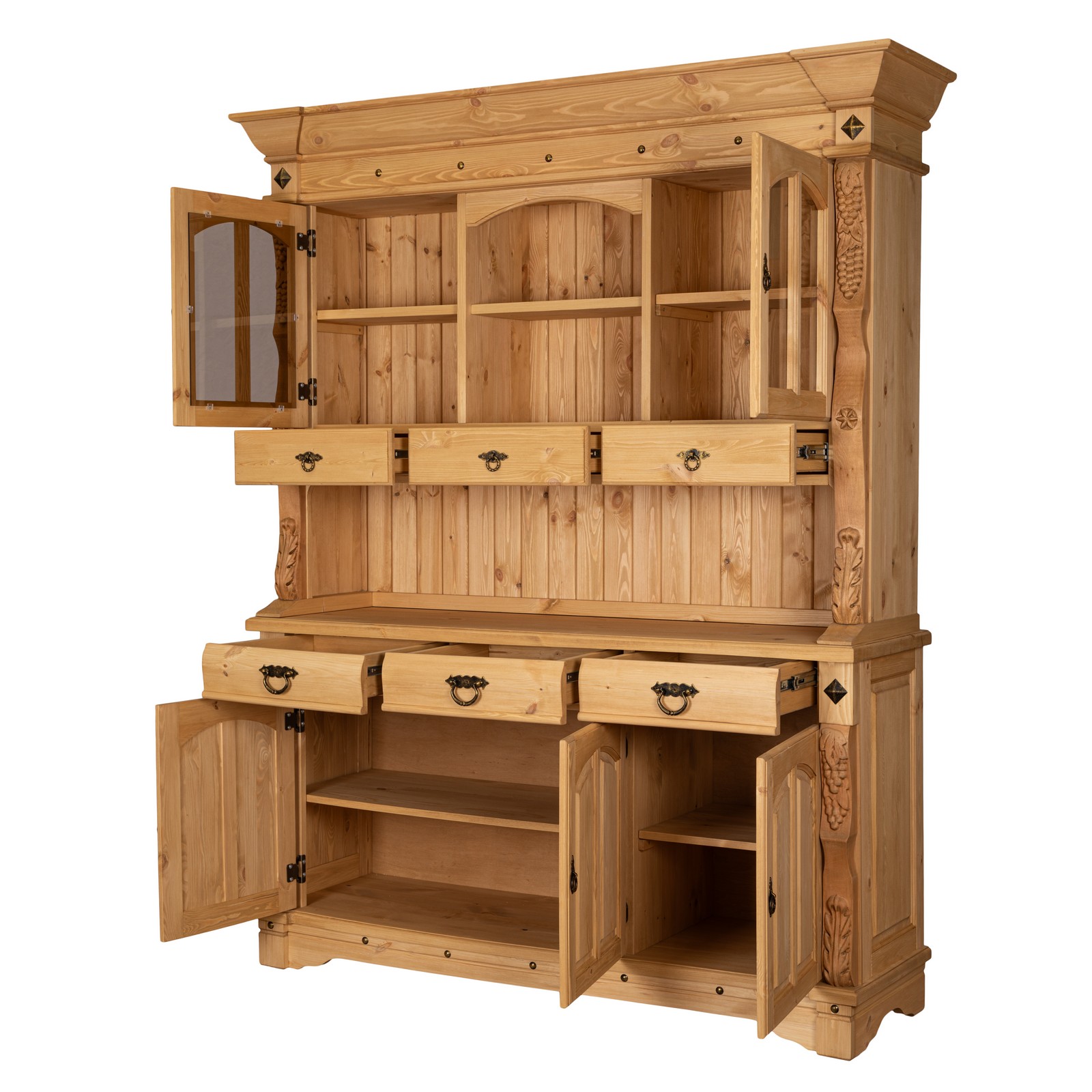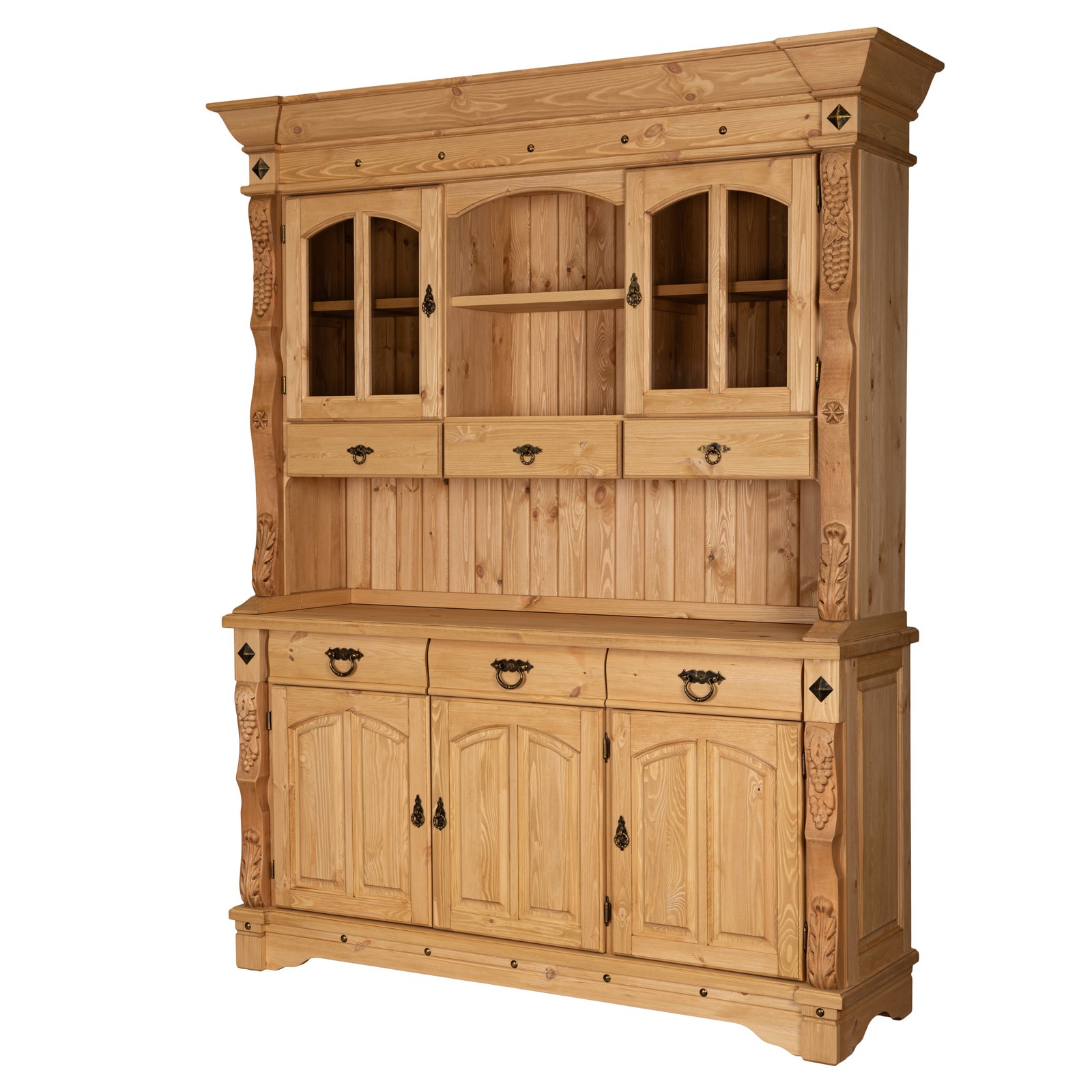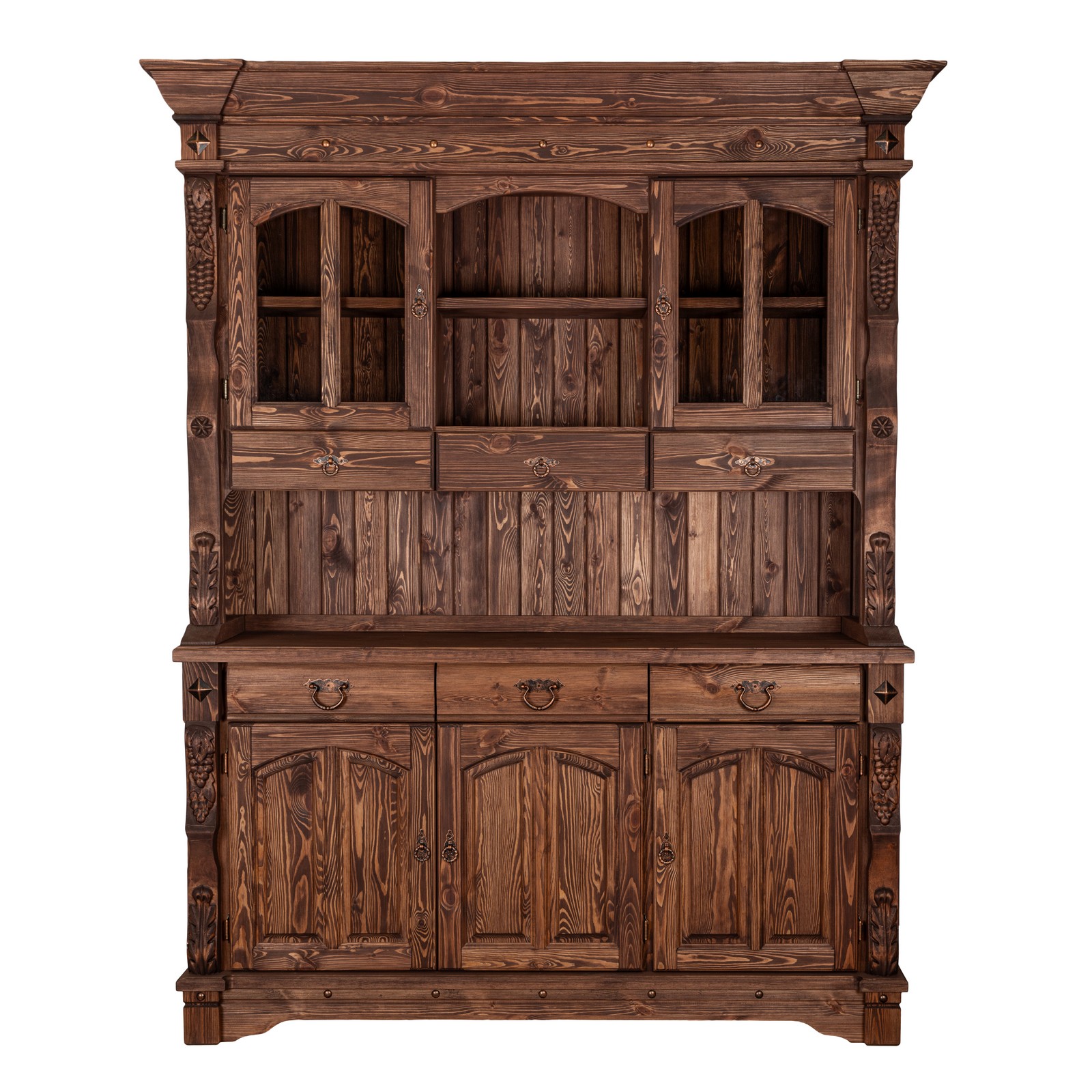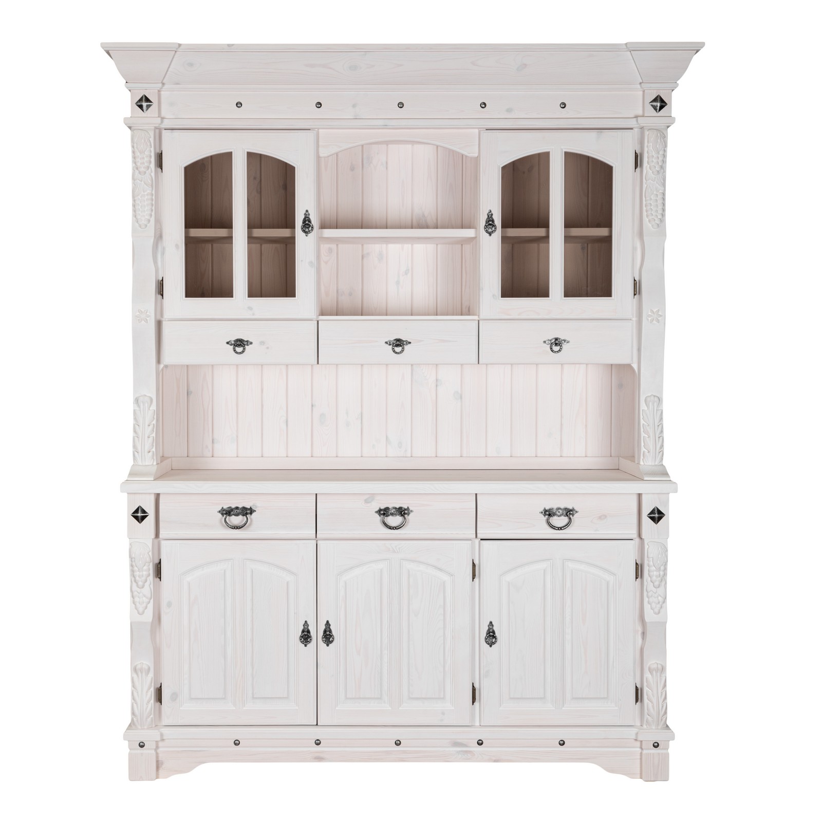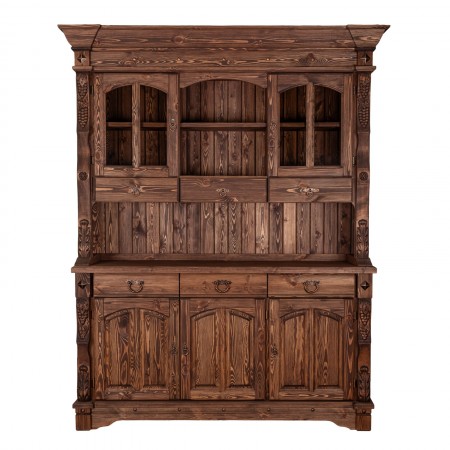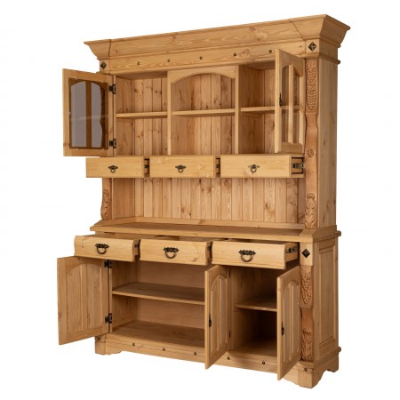 Буфет-витрина изготовлен из массива сосны. Отделка под искусственное старение, округлые филенчатые вставки и природные резные узоры по бокам придают оформлению оригинальный стилистический оттенок в провинциальной французской традиции.