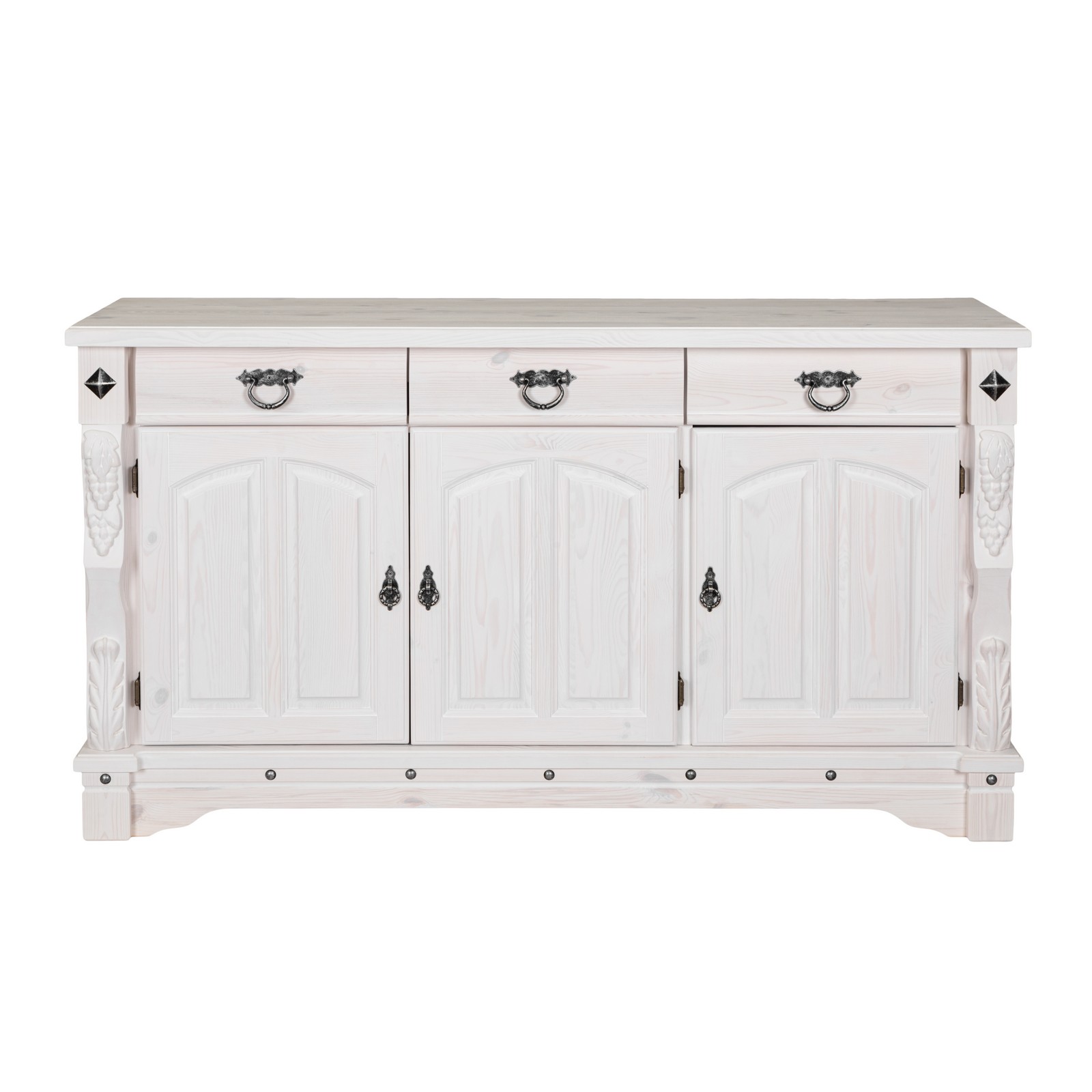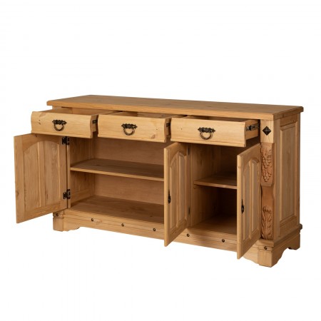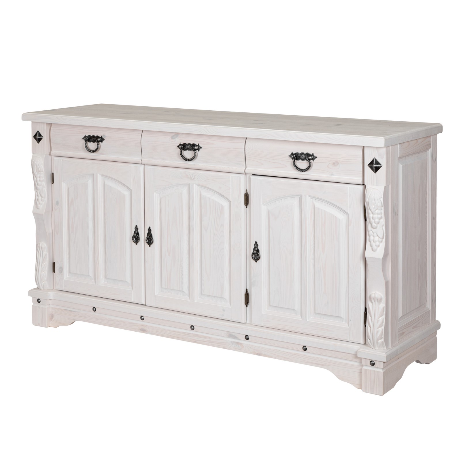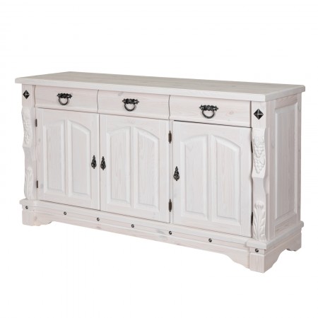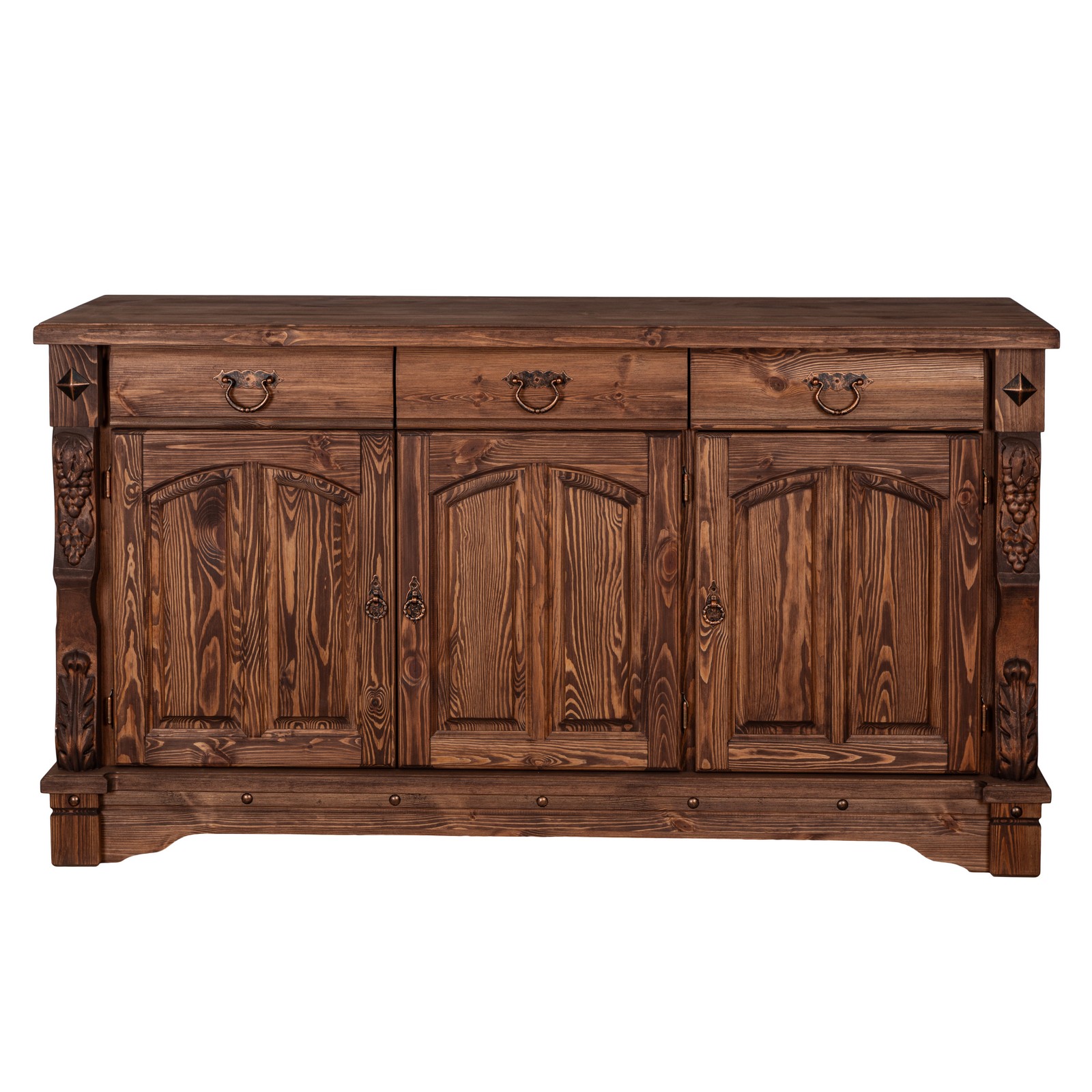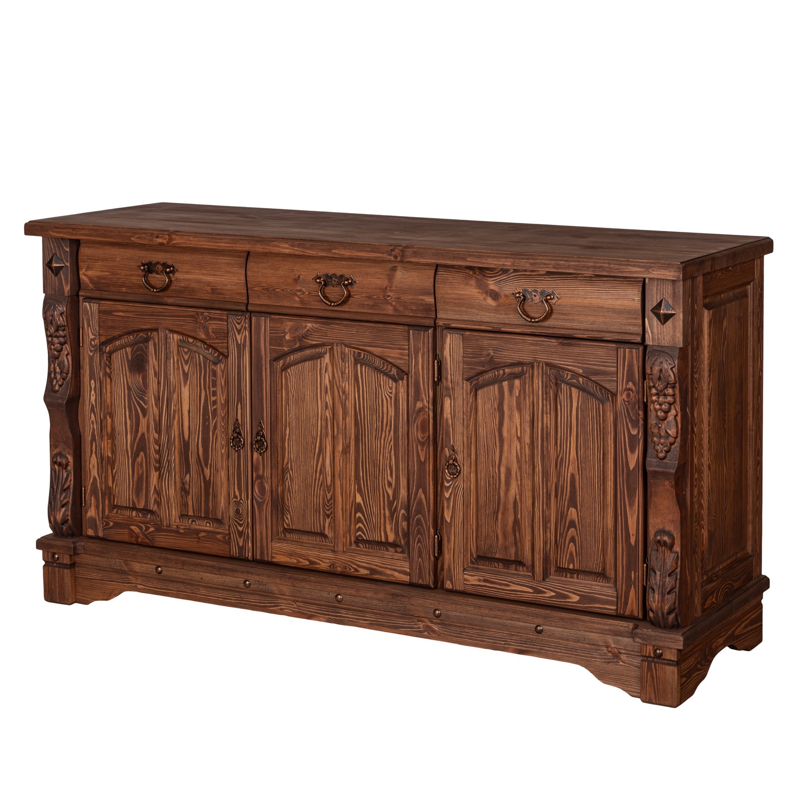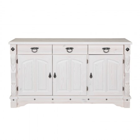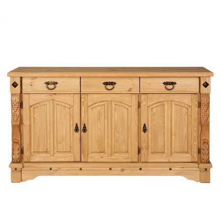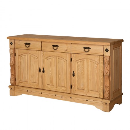 Трехдверный комод Викинг GL из массива сосны - особое украшение его служит резные элементы с гроздьями винограда. Подчеркнет аутентичный стиль загородного дома. Используется на кухне или в столовой для хранения посуды и необходимых вещей. Благодаря компактным габаритам легко впишется в небольшое помещение.