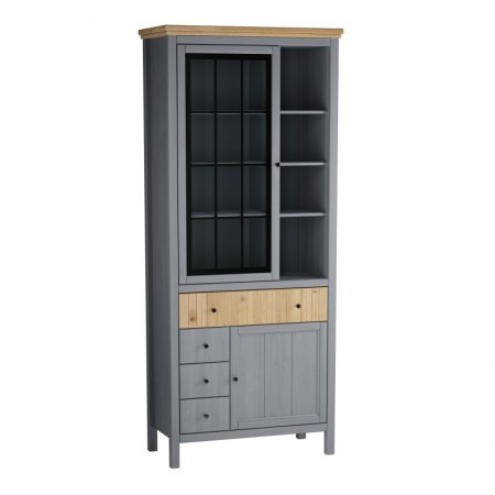 Шкаф для посуды имеет отделение с полками, четыре ящика на шариковых направляющих, дверку со стеклом и глухую дверку, за дверками расположены 3 и 1 полка.