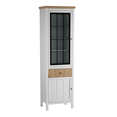 Шкаф для посуды имеет ящик на шариковых направляющих, дверку со стеклом и глухую дверку, за дверками расположены 3 и 1 полка.