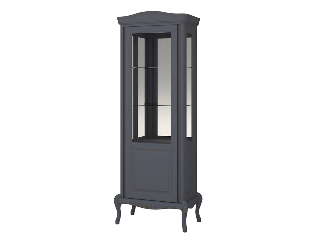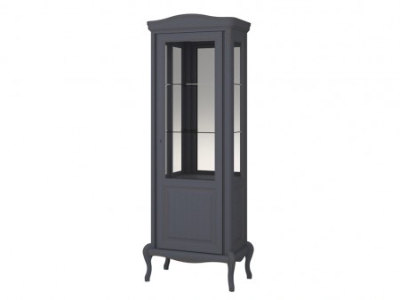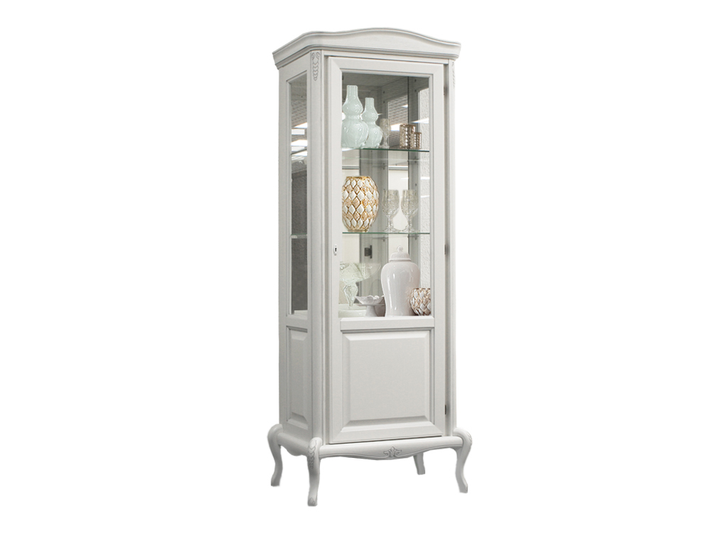 Шкаф с витриной имеет подсветку, по задней стенке установлено зеркало, в закрытом отделении за распашной дверью несъёмная полка для хранения бутылок в горизонтальном положении. В тумбе распашные двери изогнутые.