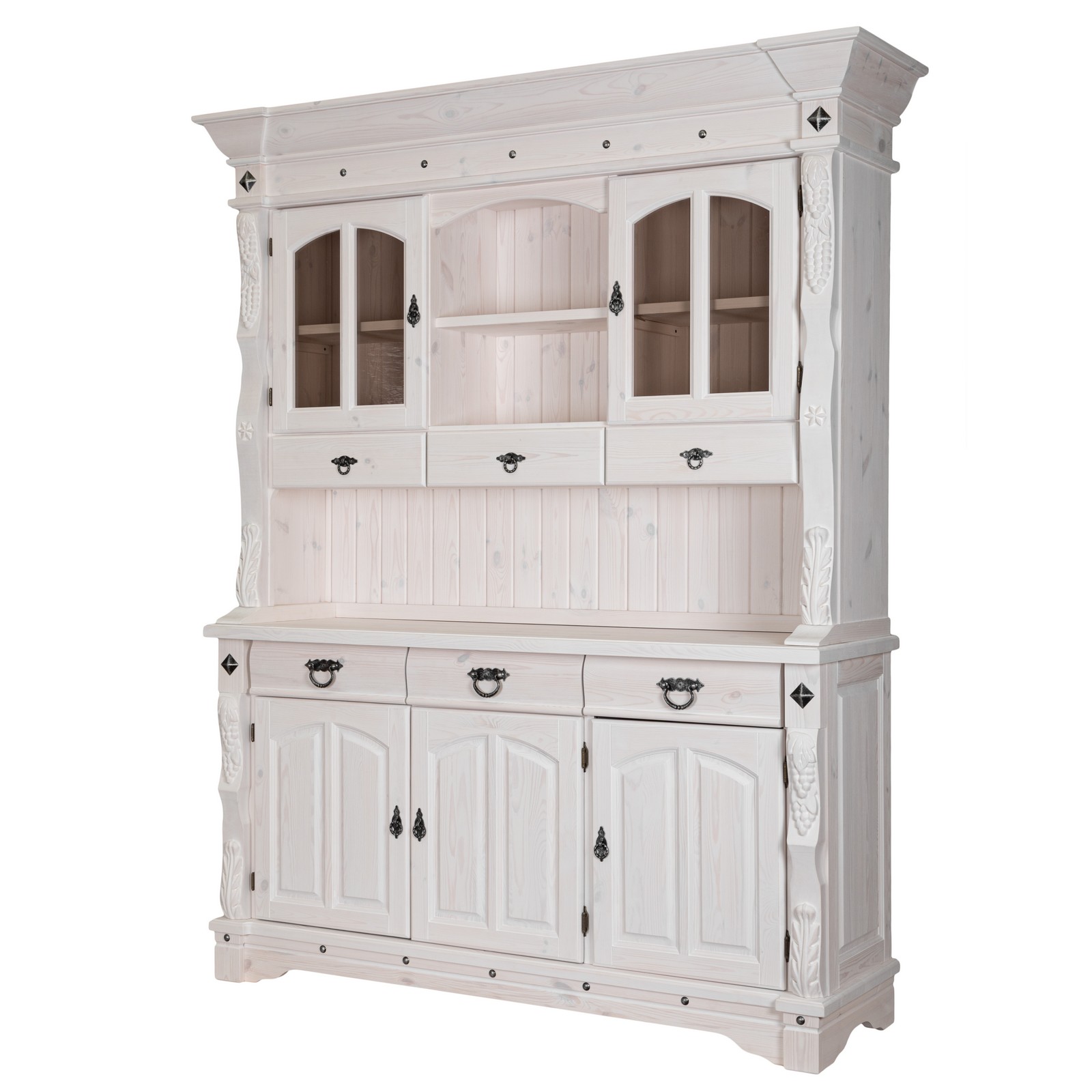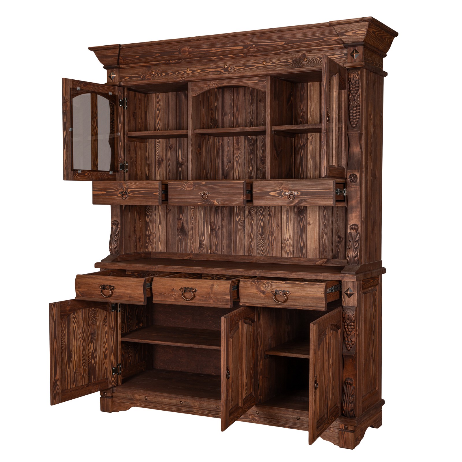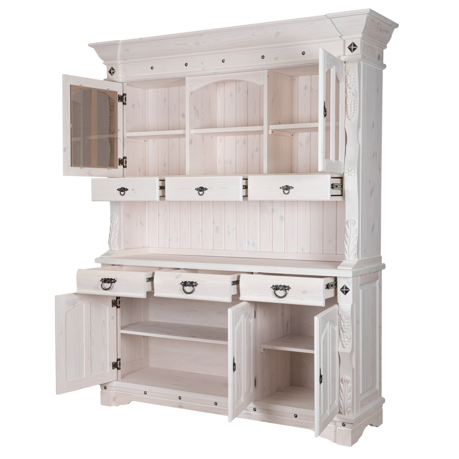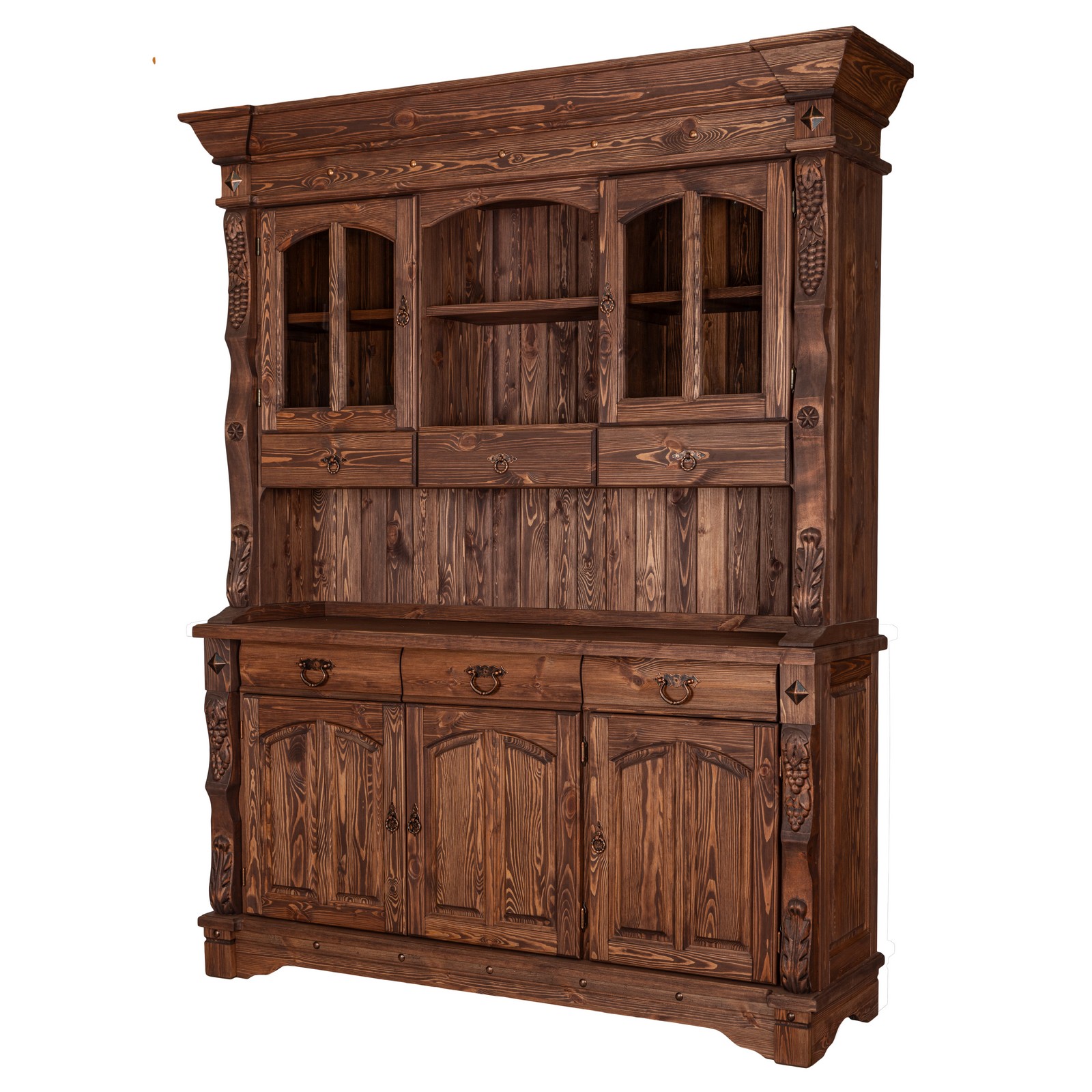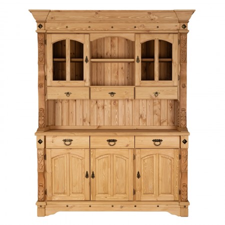 Буфет-витрина изготовлен из массива сосны. Отделка под искусственное старение, округлые филенчатые вставки и природные резные узоры по бокам придают оформлению оригинальный стилистический оттенок в провинциальной французской традиции.