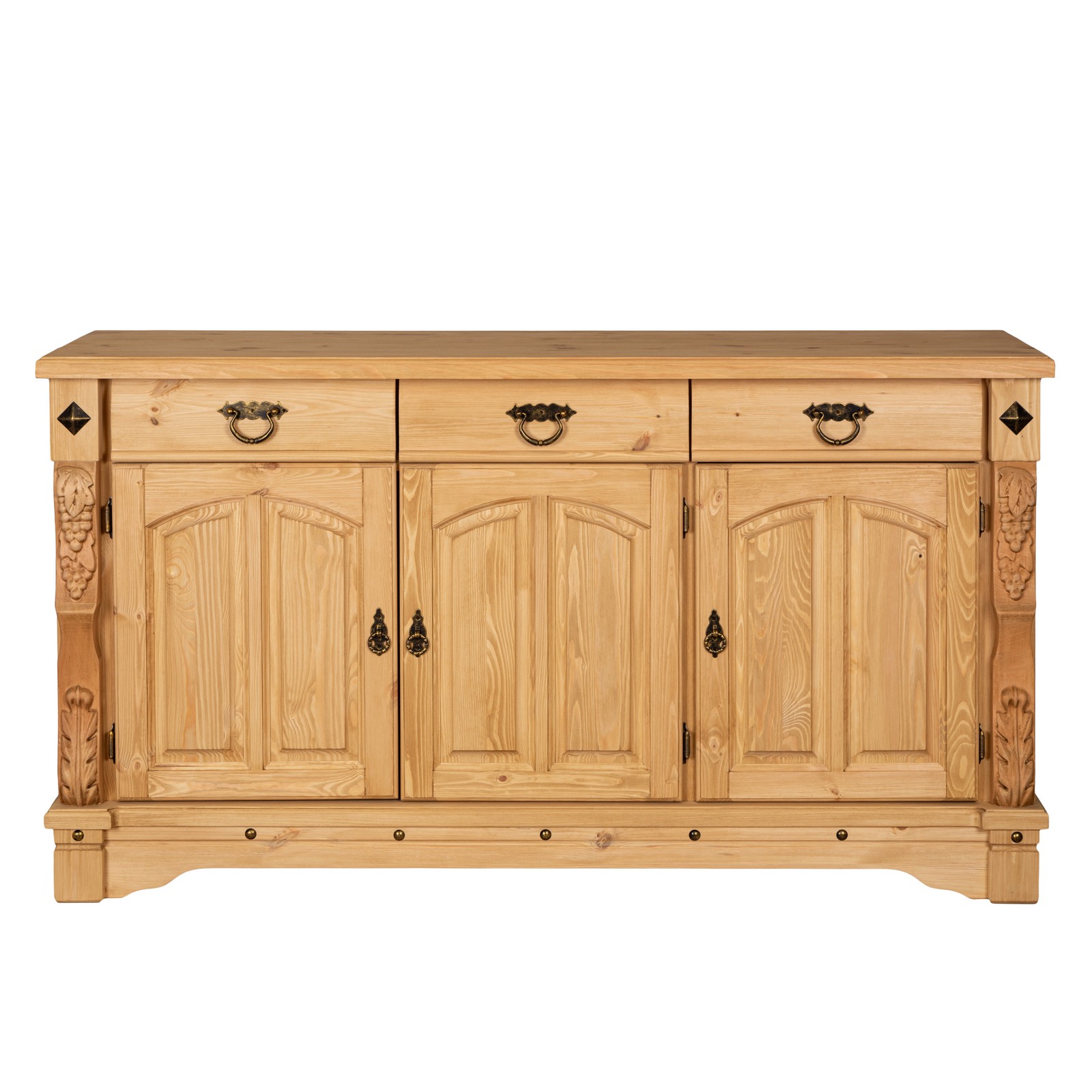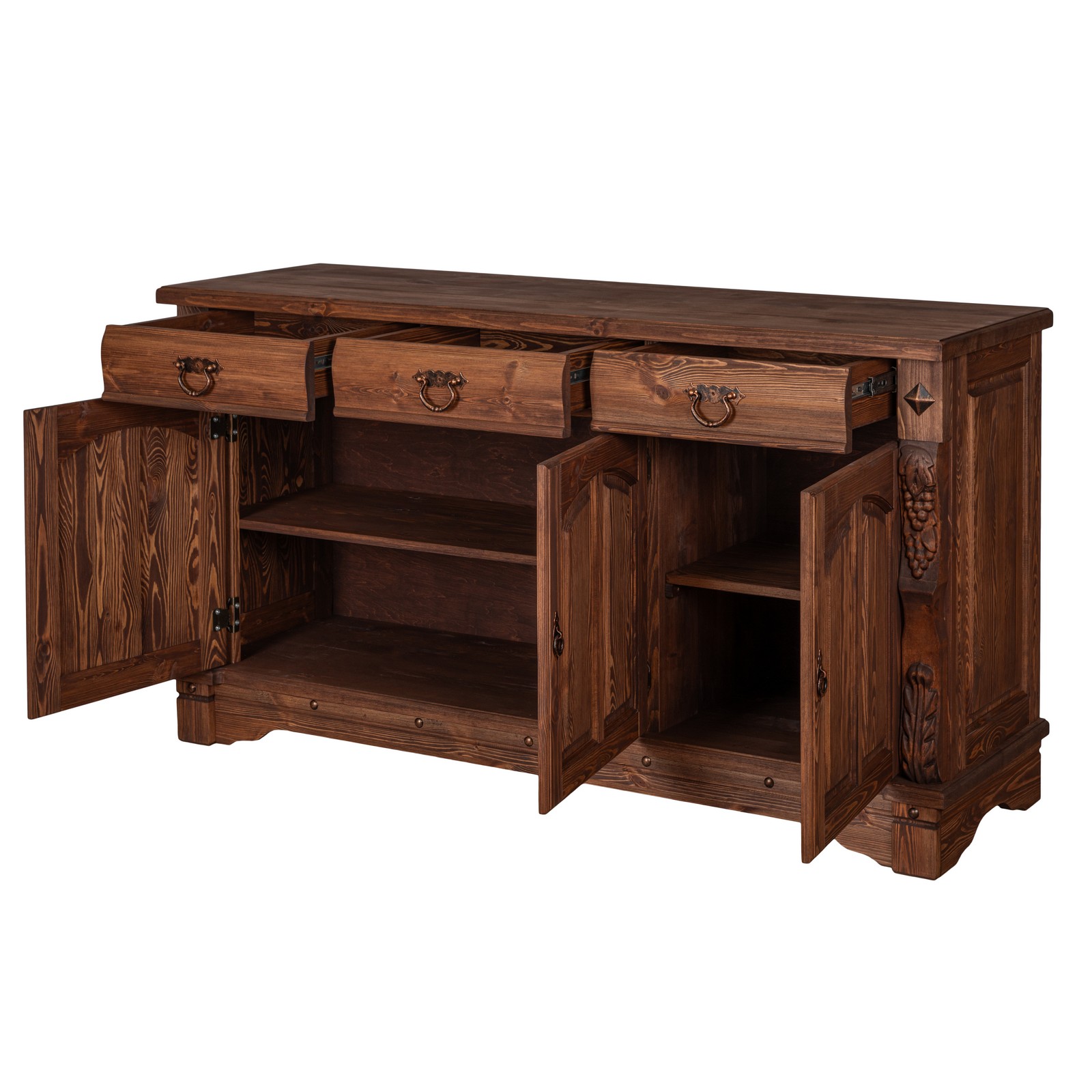 Трехдверный комод Викинг GL из массива сосны - особое украшение его служит резные элементы с гроздьями винограда. Подчеркнет аутентичный стиль загородного дома. Используется на кухне или в столовой для хранения посуды и необходимых вещей. Благодаря компактным габаритам легко впишется в небольшое помещение.