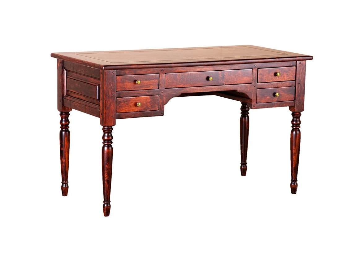 Письменный стол в классическом французском стиле не обязательно должен быть тяжелым и громоздким. Пять удобных ящиков разного размера размещены непосредственно под столешницей. Благодаря свободному пространству снизу, изделие кажется достаточно легким и не перегружает интерьер. Эффект старения усилен имитацией работы жука-древоточца (шашеля).