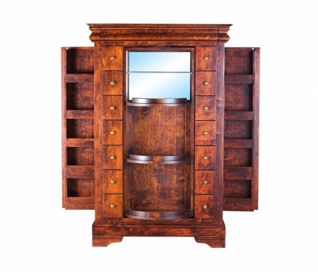 Фасад и корпус изделия из коллекции «Луи-Филипп» изготовлены из массива ольхи, поверхность колорирована восковой мастикой. Для тонировки применяют метод втирания. Такая обработка подчеркивает красивую структуру древесины и сохраняет ее оригинальный рисунок. Дизайн выполнен в стиле роскошной классики, поэтому органично впишется в любой интерьер гостиной или столовой.