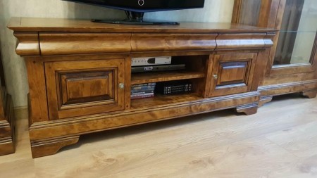 Тумба под ТВ, выполненная белорусскими мастерами фабрики "Фенэча Арт" из настоящего массива ольхи выполнена в классическом присущем данной коллекции стиле.