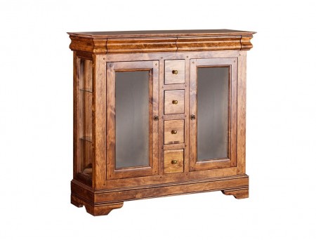 Дверцы со стеклом, боковые стенки из прозрачного стекла и ряд маленьких выдвижных ящичком придают этой модели особый шарм. Такая универсальна вещь будет органично смотреться в гостиной, спальне и столовой. Модель с успехом может выполнять функции: