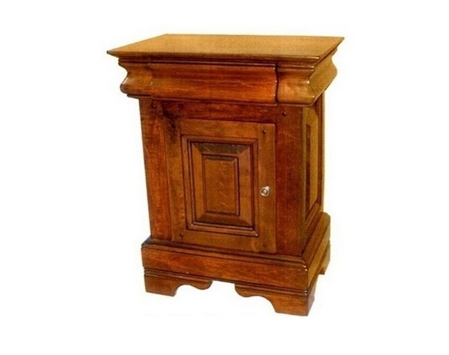Тумба выполнена во французском стиле. В верхней части, которая напоминает резную капитель, находится выдвижной ящик, под ним установлена дверца. Фурнитура и элементы фрезеровки по дереву придают предметам интерьера изысканный и совершенный вид.