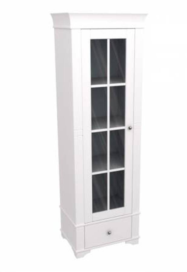 1. Витрина со стеклянной дверью. Один выдвижной ящик в нижней части и три полки за дверью.