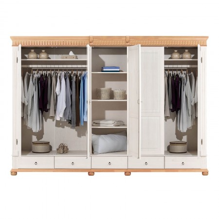 Белорусский шкаф “Хельсинки" 5SPGT-M с зеркалом и 5 распашными дверями надежно сохранит вещи для всей семьи. На одну из дверей установлено зеркало в полный рост. Внутри: два отделения для одежды со штангами, несколько полок для остальных вещей и головных уборов. Под каждой дверью находится выдвижной ящик.