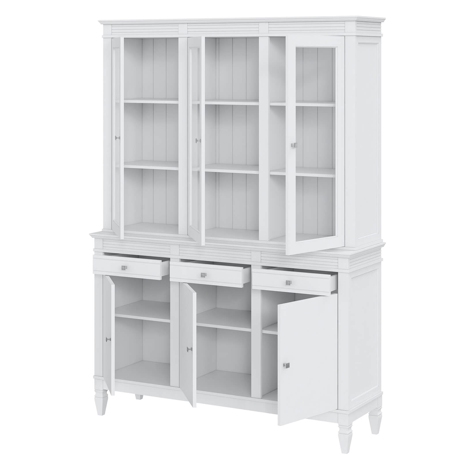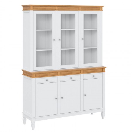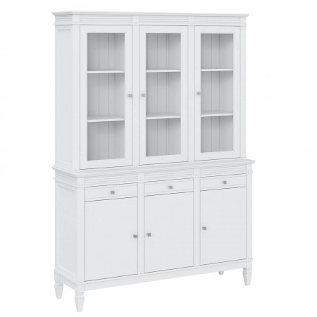 Буфет выполнен из массива сосны. Удобный и вместительный, очень прост, но при этом функционален. Отлично впишется как в обеденную так и в гостиную. Буфет визуально разделен на 3 секции которые укомплектованы шестью полками сверху за тремя стеклянными дверями, тремя полками снизу за тремя распашными дверями и тремя ящиками.
