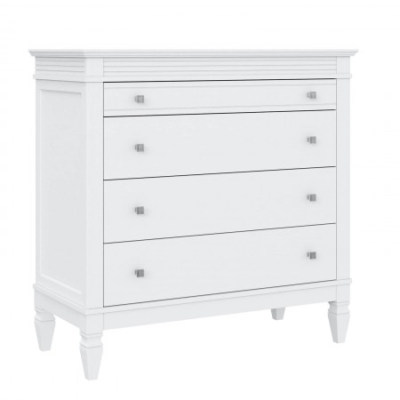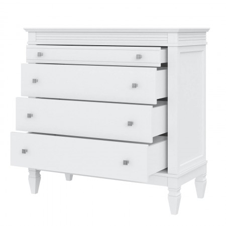 Комод «Ольса» 204 – это классическая и стильная вещь. Она станет полезным приобретением для гостиной, спальни или прихожей. Состоит из четырех выдвижных ящиков, верхний чуть менее глубокий. Они плавно скользят по направляющим скрытого монтажа немецкого бренда BLUM, оснащены доводчиками. С лицевой стороны установлены квадратные металлические ручки под состаренное серебро, которые создавались в Италии фирмой Giusti.