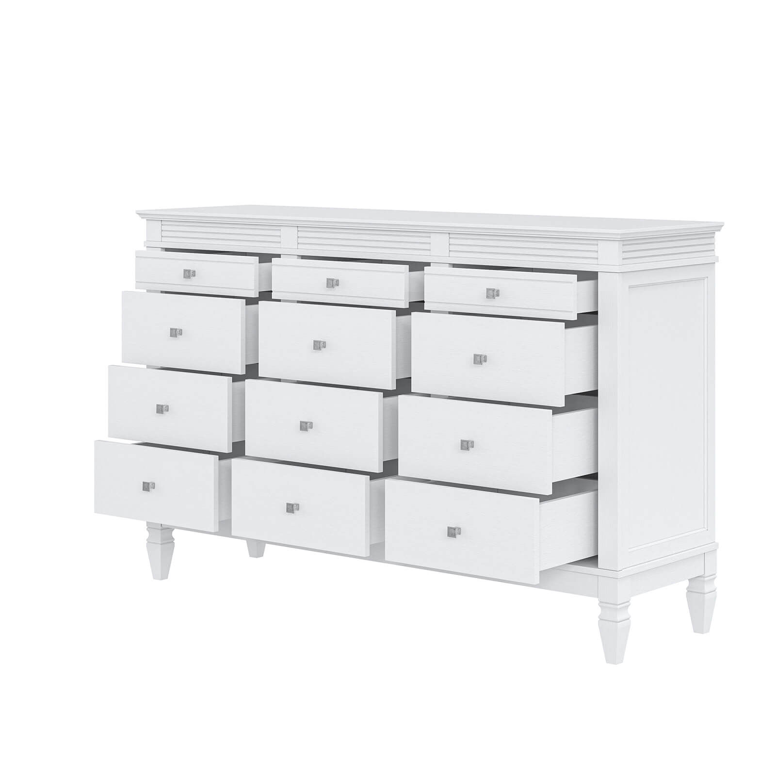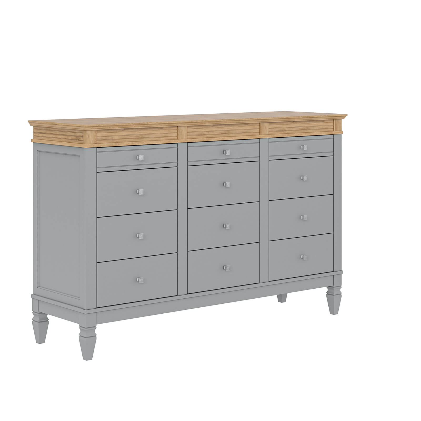 Комод оснащен двенадцатью ящиками. Фурнитура на ящиках с доводчиками. Высокие ножки обеспечивают оптимальный доступ при уборке.