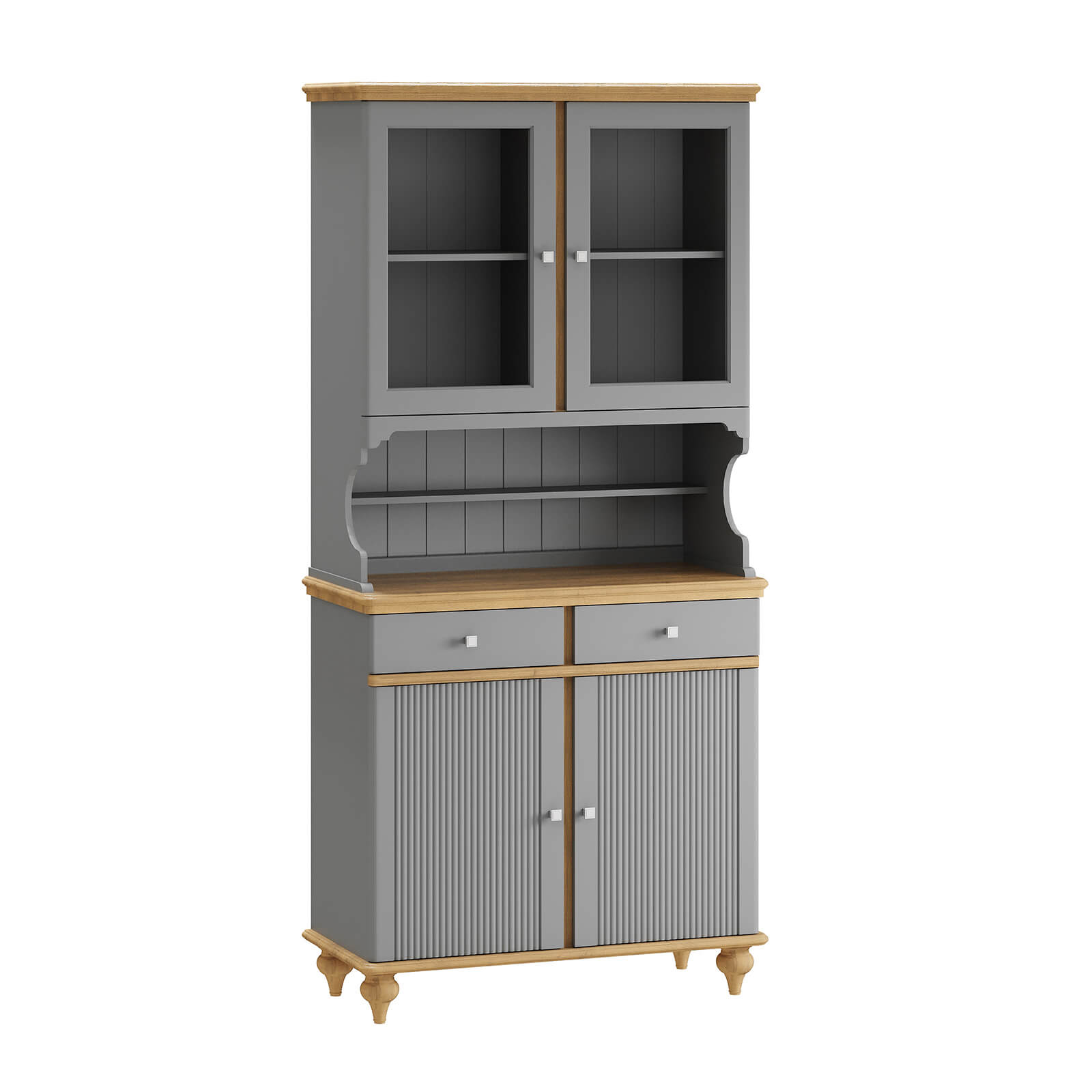 Буфет оснащен двумя распашными дверками с полками внутри и двумя ящиками снизу, двумя распашными, стеклянными, дверками сверху. Фурнитура на дверях и ящиках с доводчиками. Высокие ножки обеспечивают оптимальный доступ при уборке.