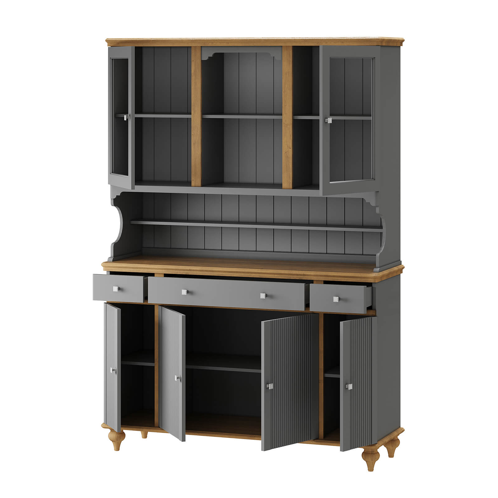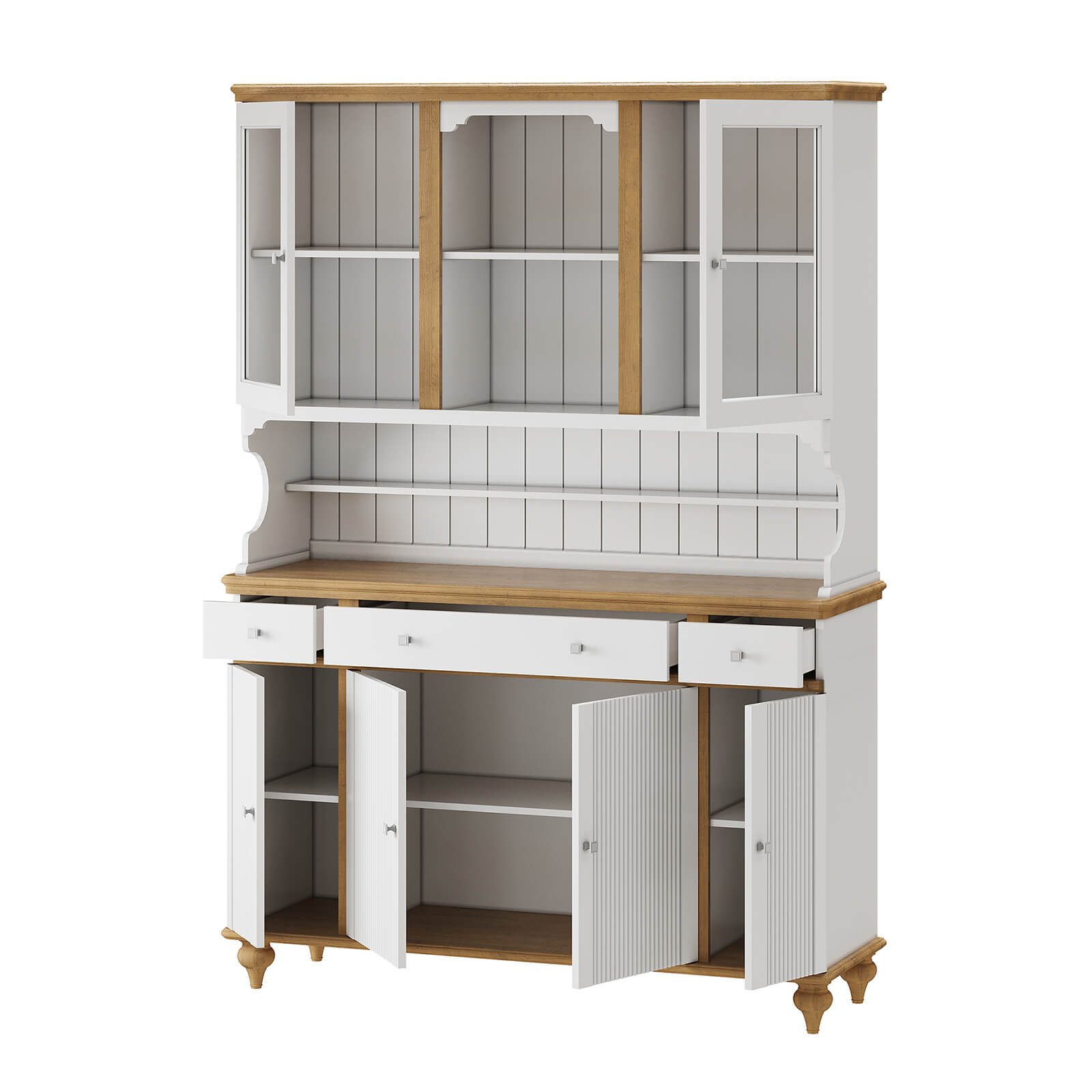 Буфет оснащен четырьмя распашными дверками с полками внутри и тремя ящиками снизу, двумя распашными, стеклянными, дверками сверху. Фурнитура на дверях и ящиках с доводчиками. Высокие ножки обеспечивают оптимальный доступ при уборке.