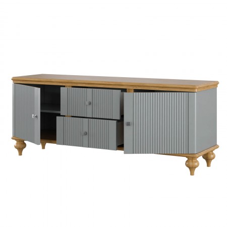 Тумба ТВ оснащена двумя выдвижными ящиками и двумя полками за распашными дверями. Фурнитура на ящиках и дверях с доводчиками. Высокие ножки обеспечивают оптимальный доступ при уборке.