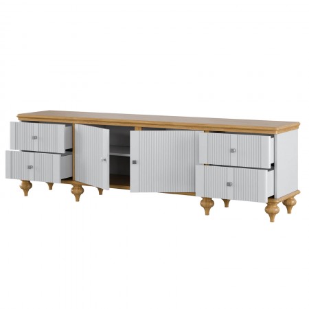 Тумба ТВ оснащена четырьмя выдвижными ящиками и двумя полками за распашными дверями. Фурнитура на ящиках и дверях с доводчиками. Высокие ножки обеспечивают оптимальный доступ при уборке.