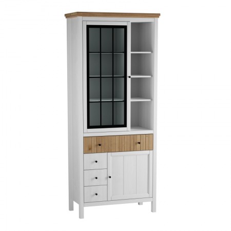 Шкаф для посуды имеет отделение с полками, четыре ящика на шариковых направляющих, дверку со стеклом и глухую дверку, за дверками расположены 3 и 1 полка.