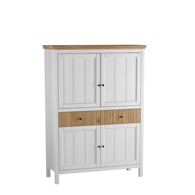 Тумба имеет два ящика на шариковых направляющих и четыре глухие дверки, за каждой дверкой расположена полка.