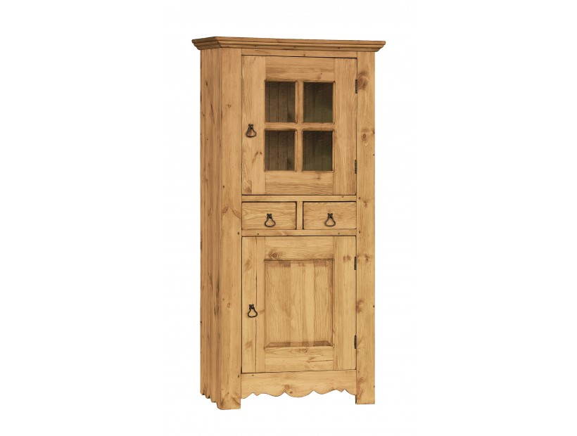 Несмотря на свой достаточно лаконичный внешний вид, это весьма занимательная вещь. Область использования этого шкафа не ограничивается только кухней. Он может стать отличным вариантом для библиотеки или детской комнаты. Верхний отсек со стеклом - прекрасное обрамление для красивой посуды или книг в дорогом переплете. Нижняя часть с закрытой дверью скроет от посторонних глаз бытовую технику, полотенца или журналы. По центру размещены два ящика для разных мелочей.