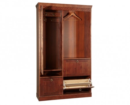 Шкаф имеет двойную вешалку с четырьмя крючками для верхней одежды, открытую штангу, два отделения веерного типа для обуви и откидную дверку с нишей.